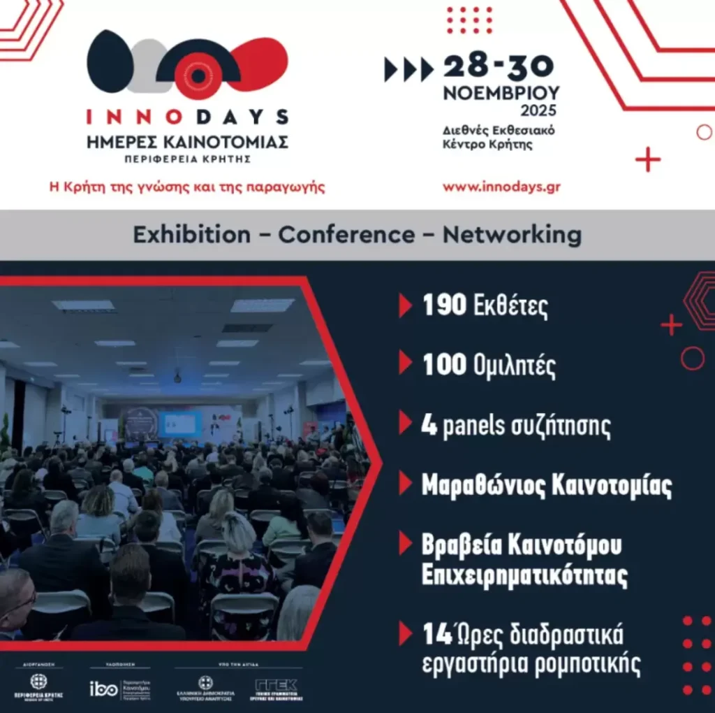 Το μεγαλύτερο γεγονός καινοτομίας και επιχειρηματικότητας του νησιού, τις Ημέρες Καινοτομίας Περιφέρειας Κρήτης «InnoDays 2025», διοργανώνει για μία ακόμη χρονιά η Περιφέρεια Κρήτης. Η διοργάνωση, που φέτος έχει τίτλο «Η Κρήτη της Γνώσης και της Παραγωγής», θα πραγματοποιηθεί από τις 28 έως τις 30 Νοεμβρίου 2025 στο Διεθνές Εκθεσιακό Κέντρο Κρήτης, στις Γούβες Ηρακλείου.