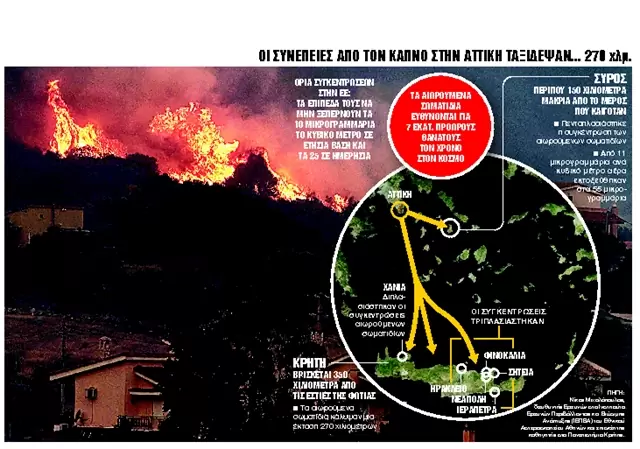 Πνίγηκαν στα αιωρούμενα σωματίδια η Σύρος και η Κρήτη εξαιτίας της πυρκαγιάς στην Ανατολική Αττική (!). Οπως επισημαίνει μιλώντας στα «ΝΕΑ» ο διευθυντής Ερευνών στο Ινστιτούτο Ερευνών Περιβάλλοντος και Βιώσιμης Ανάπτυξης (ΙΕΠΒΑ) του Εθνικού Αστεροσκοπείου Αθηνών και επισκέπτης καθηγητής στο Πανεπιστήμιο Κρήτης, Νίκος Μιχαλόπουλος, ο καπνός «άπλωσε» και ταξίδεψε στο Αιγαίο έως τη Σύρο και την Κρήτη.