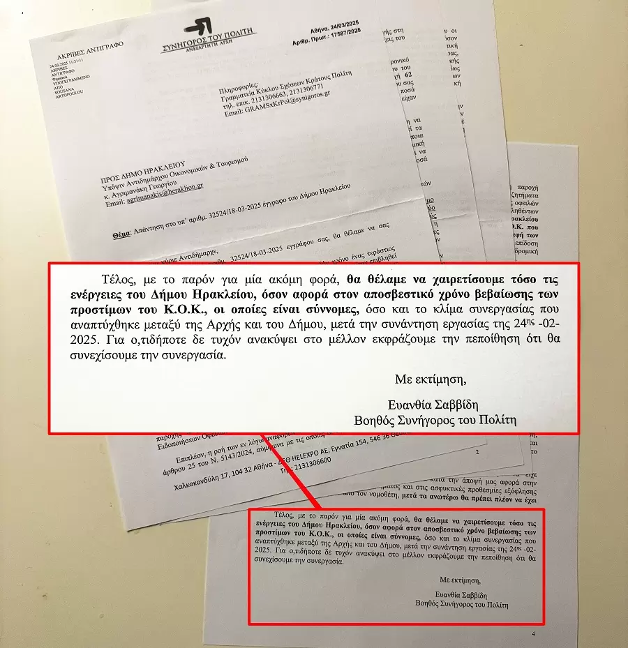 Όπως χαρακτηριστικά καταλήγει η επιστολή του Συνηγόρου του Πολίτη που υπογράφεται από την Ευανθία Σαββίδη: «Κατόπιν των ανωτέρω θεωρούμε ότι, οποιαδήποτε σχέση μπορεί να είχε δημιουργηθεί στους πολίτες του Δήμου σας, η οποία κατά την άποψη μας αφορά στην πολυπλοκότητα του συγκεκριμένου ζητήματος και στις ασφυκτικές προθεσμίες εξόφλησης των οφειλών που ετέθησαν από τον νομοθέτη, μετά τα ανωτέρω θα πρέπει πλέον να έχει εκλείψει. Τέλος, με το παρόν για μια ακόμη φορά, θα θέλαμε να χαιρετίσουμε τόσο τις ενέργειες του Δήμου Ηρακλείου, όσον αφορά στον αποσβεστικό χρόνο βεβαίωσης των προστίμων του Κ.Ο.Κ., οι οποίες είναι σύννομες, όσο και το κλίμα συνεργασίας που αναπτύχθηκε μεταξύ της Αρχής και του Δήμου, μετά την συνάντηση εργασίας της 24ης -2-2025.»