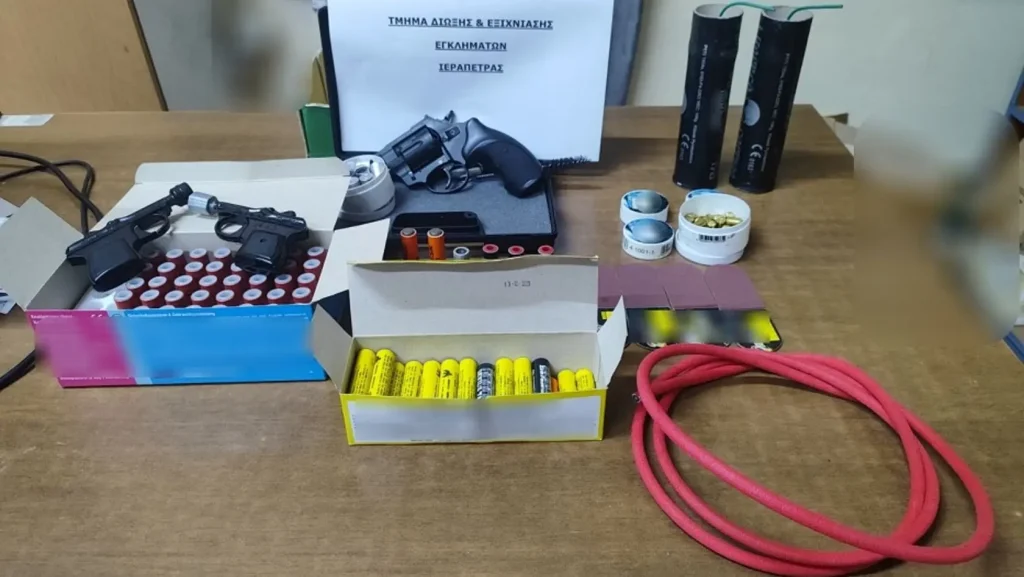 Σε ανακοίνωση της ΕΛ.ΑΣ τονίζεται: Συνελήφθη, χθες (28.03.2025) το μεσημέρι σε περιοχή του Δήμου Ιεράπετρας από αστυνομικούς του Τμήματος Δίωξης και Εξιχνίασης Εγκλημάτων Ιεράπετρας, 37χρονη ημεδαπή κατηγορούμενη για παραβάσεις των νόμων περί όπλων και φωτοβολίδων και εκρηκτικών.Ειδικότερα, στο πλαίσιο του ειδικού σχεδιασμού και δράσεων που εκπονεί η Διεύθυνση Αστυνομίας Ηρακλείου για την καταπολέμηση παραβατικών ενεργειών και κατόπιν κατάλληλης αξιοποίησης στοιχείων από αστυνομικούς της ανωτέρω υπηρεσίας, πραγματοποιήθηκε έρευνα στην οικία και της ημεδαπής. Κατά τη διάρκεια της έρευνας βρέθηκαν και κατασχέθηκαν: