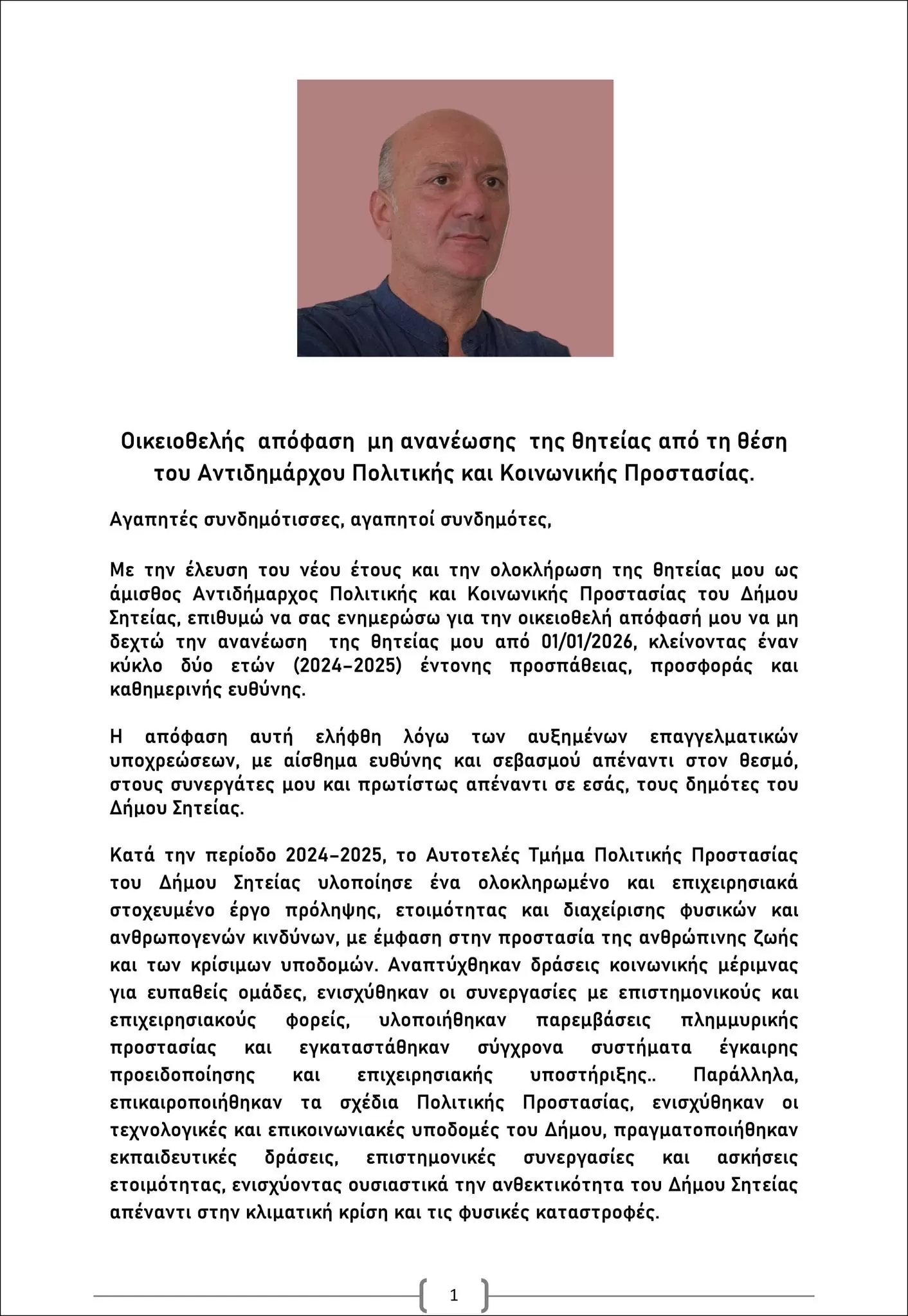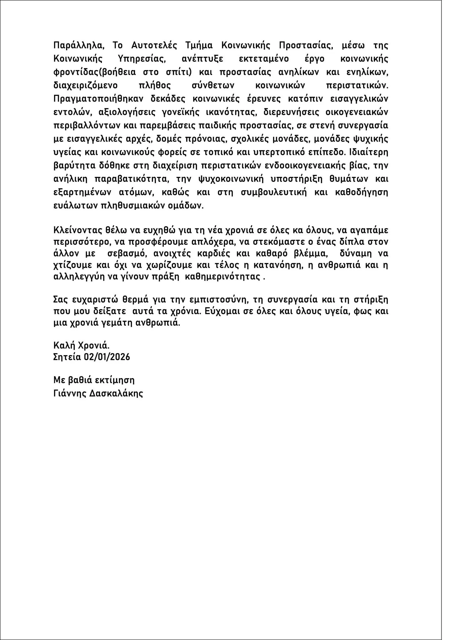 Ο Γιάννης Δασκαλάκης έκανε γνωστό ότι, λόγω αυξημένων επαγγελματικών υποχρεώσεων δεν ανανεώνει τη θητεία του στο Δήμο Σητείας ως άμισθος Αντιδήμαρχος Πολιτικής και Κοινωνικής Προσταστίας. Αναλυτικά: