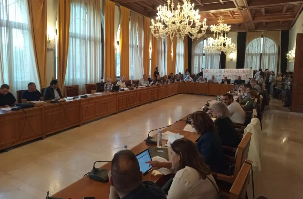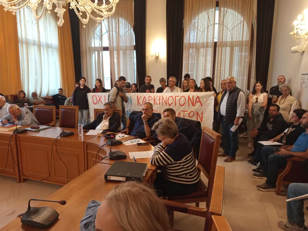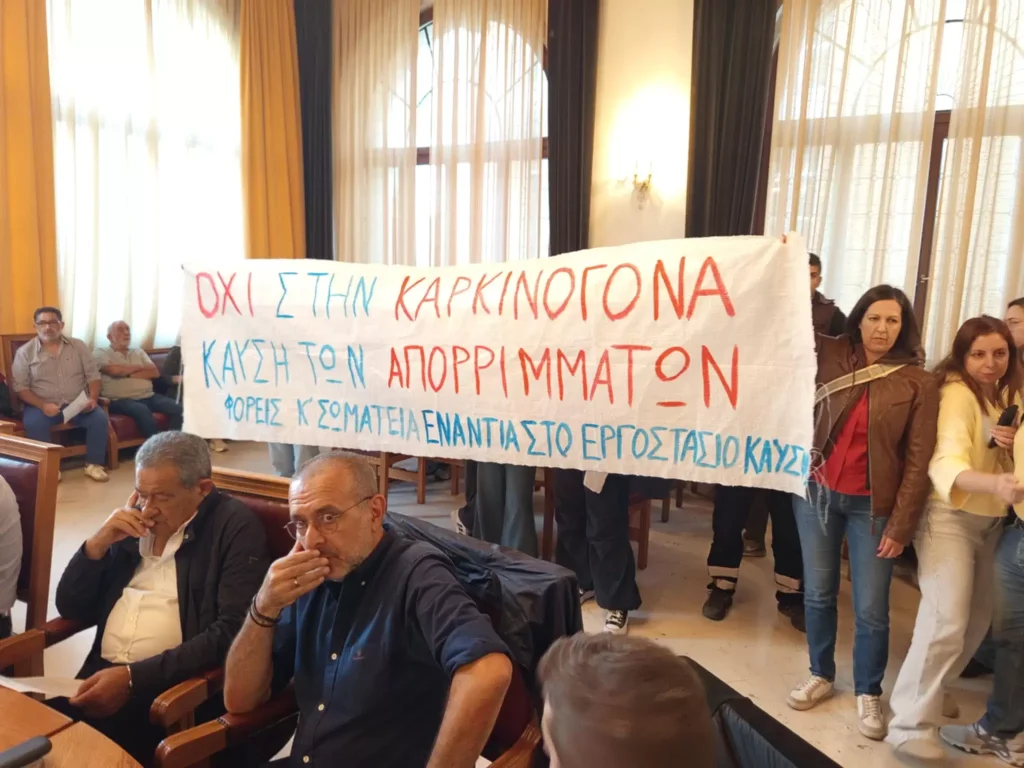 Στην αίθουσα της Λότζια εκπρόσωποι σωματείων ύψωσαν πανό κατά της δημιουργίας του εργοστασίου γράφοντας ότι πρόκειται για μια καρκινογόνο μονάδα.