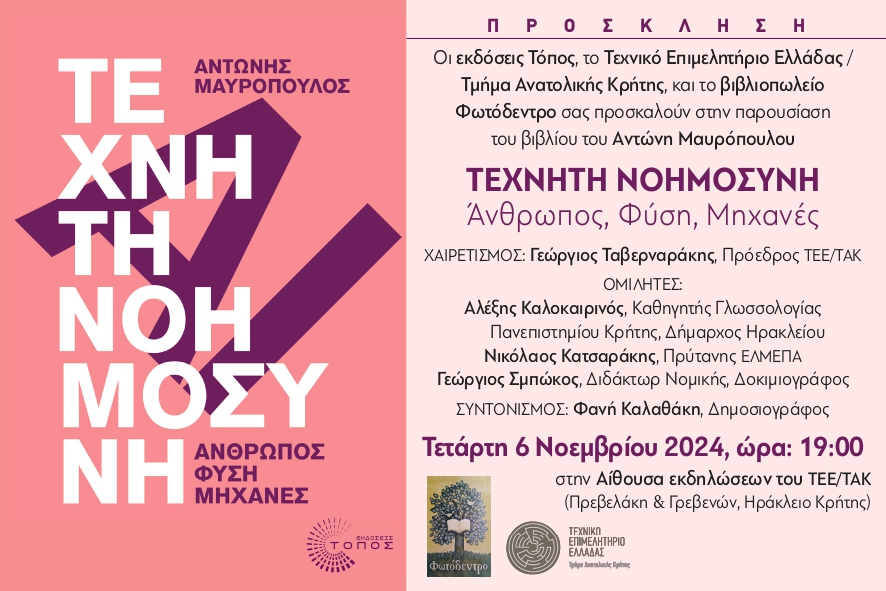Η συζήτηση αυτή, θα πραγματοποιηθεί με αφορμή την έκδοση του βιβλίου του κ. Αντώνη Μαυρόπουλου, με τίτλο: “Τεχνητή Νοημοσύνη, Άνθρωπος, Φύση, Μηχανές”.
