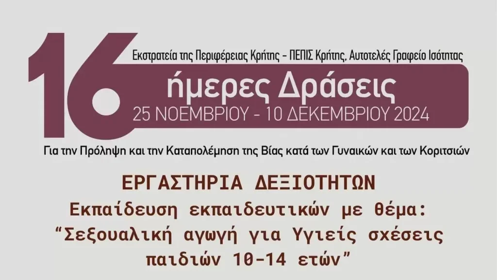 Η Περιφέρεια Κρήτης, Αυτοτελές Γραφείο Ισότητας, Περιφερειακή Επιτροπή Ισότητας των Φύλων Κρήτης, σε συνεργασία με την Α.ΞΕ.Π.Τ. «Ασφαλή Ξένοιαστα Παιδιά Τώρα», υλοποιούν από το 2022 εκπαιδευτικά-βιωματικά εργαστήρια σεξουαλικής αγωγής για γονείς, εκπαιδευτικούς, παιδιά και εφήβους, στο πλαίσιο των «16ήμερων Δράσεων για την Πρόληψη και την Καταπολέμηση της Βίας κατά των Γυναικών και των Κοριτσιών», σε συνεργασία με σχολικές μονάδες, συλλόγους γονέων και κηδεμόνων, συλλόγους διδασκόντων, πολιτιστικούς συλλόγους, αλλά και Δημοτικές Επιτροπές Ισότητας σε όλη την Κρήτη.