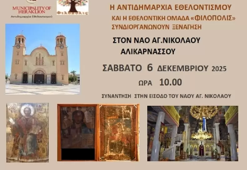 Στον Ιερό Ναό του Αγίου Νικολάου στη Νέα Αλικαρνασσό θα πραγματοποιηθεί το Σάββατο 6 Δεκεμβρίου στις 10:00 εορταστική ξενάγηση στο πλαίσιο των «Χαρτοδιαδρομών… στο Δήμο μας» που διοργανώνει η Αντιδημαρχία Εθελοντισμού του Δήμου Ηρακλείου σε συνεργασία με την Ομάδα «Φιλόπολις» και την ξεναγό Αθηνά Κυριακάκη- Σφακάκη.