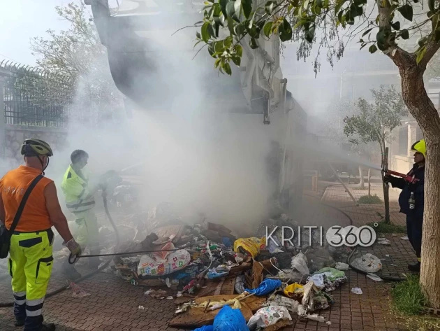 Το περιστατικό ξεκίνησε όταν το όχημα κινούνταν στην οδό Σφακίων και, σύμφωνα με εκτιμήσεις, η αιτία φαίνεται να ήταν αντικείμενο που είχε πεταχτεί στα σκουπίδια και έκαιγε, ένα φαινόμενο που έχει καταγραφεί και στο παρελθόν.