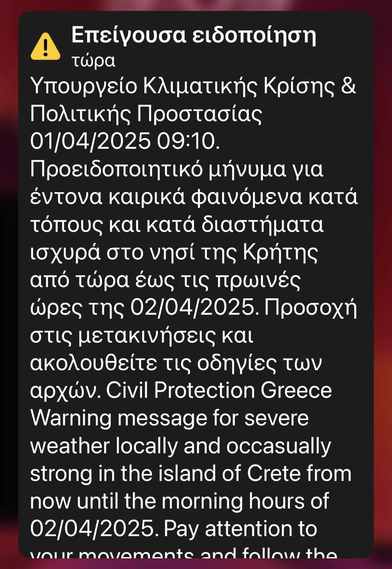 Προσοχή στις μετακινήσεις…  Η κακοκαιρία που έχει… σαρώσει τις τελευταίως ώρες τις Κυκλάδες φτάνει και στην Κρήτη και ήδη σε αρκετές περιοχές ο καιρός έχει χαλάσει. Στις 9.10 το πρωί, μάλιστα, ήχησε το 112 και έστειλε προειδοποιητικό μήνυμα για έντονα καιρικά φαινόμενα κατά τόπους και κατά διαστήματα ισχυρά στο νησί από τώρα ώς τις πρώτες πρωινές ώρες της Τετάρτης (02/04).
