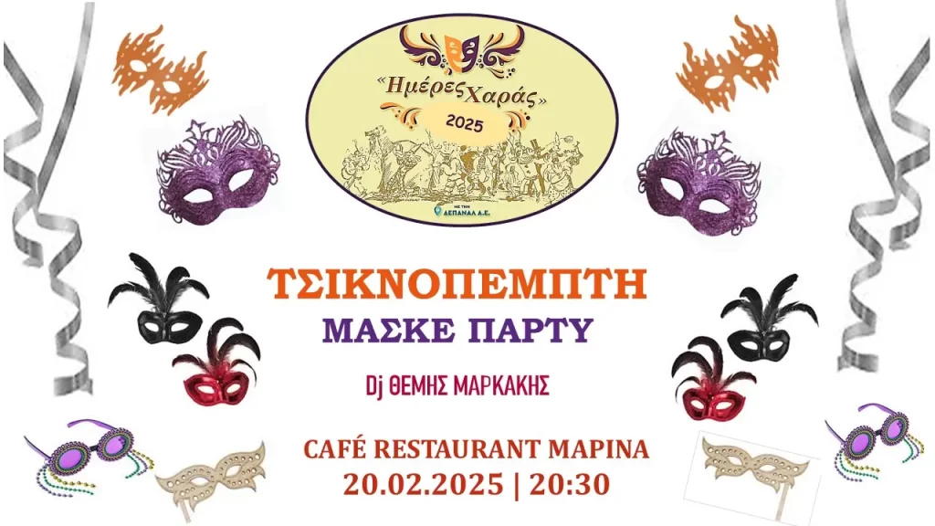 Την Τσικνοπέμπτη (Πέμπτη 20 Φεβρουαρίου) θα πραγματοποιηθεί μασκέ πάρτι με καταπληκτικές μεταμφιέσεις, τρελό κέφι και εκπλήξεις, στο Café – Restaurant «Marina» με dj τον Θέμη Μαρκάκη και ώρα έναρξης τις 20:30.