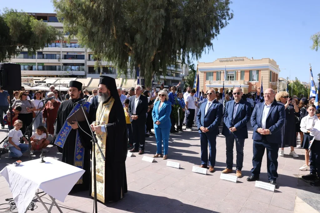Την επιμνημόσυνη δέηση τέλεσε ο Πρωτοσύγκελος της Ιεράς Αρχιεπισκοπής Κρήτης Βαρθολομαίος Βογιατζόγλου, ενώ στο άγαλμα του Άγνωστου Στρατιώτη, παρουσία των Αντιπεριφερειαρχών Νίκου Συριγωνάκη και Νίκου Ξυλούρη, στεφάνι κατέθεσαν οι: Εντεταλμένη Περιφερειακή Σύμβουλος Παιδείας και δια βίου Μάθησης Ελένη Μαράκη-Μπελαδάκη, Αντιδήμαρχος Παιδείας Δήμου Ηρακλείου Αντώνης Περισυνάκης, Περιφερειακός Διευθυντής Εκπαίδευσης Κρήτης Μανόλης Καρτσωνάκης, εκπρόσωποι Πρωτοβάθμιας και Δευτεροβάθμιας εκπαίδευσης Ηρακλείου, μαθητές του 2ου δημοτικού σχολείου Ηρακλείου και 3ου Λυκείου Ηρακλείου ως εκπρόσωποι των δημοτικών και γυμνασίων-λυκείων Ηρακλείου, εκπρόσωποι Σωμάτων Ελληνικού Οδηγισμού και Προσκόπων.