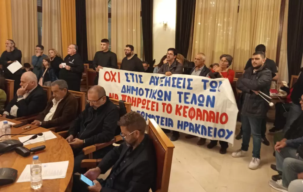 Όχι στην αύξηση των δημοτικών τελών λένε αρκετά σωματεία της πόλης που απόψε έχουν υψώσει πανό στην αίθουσα του Δημοτικού συμβουλίου Ηρακλείου.