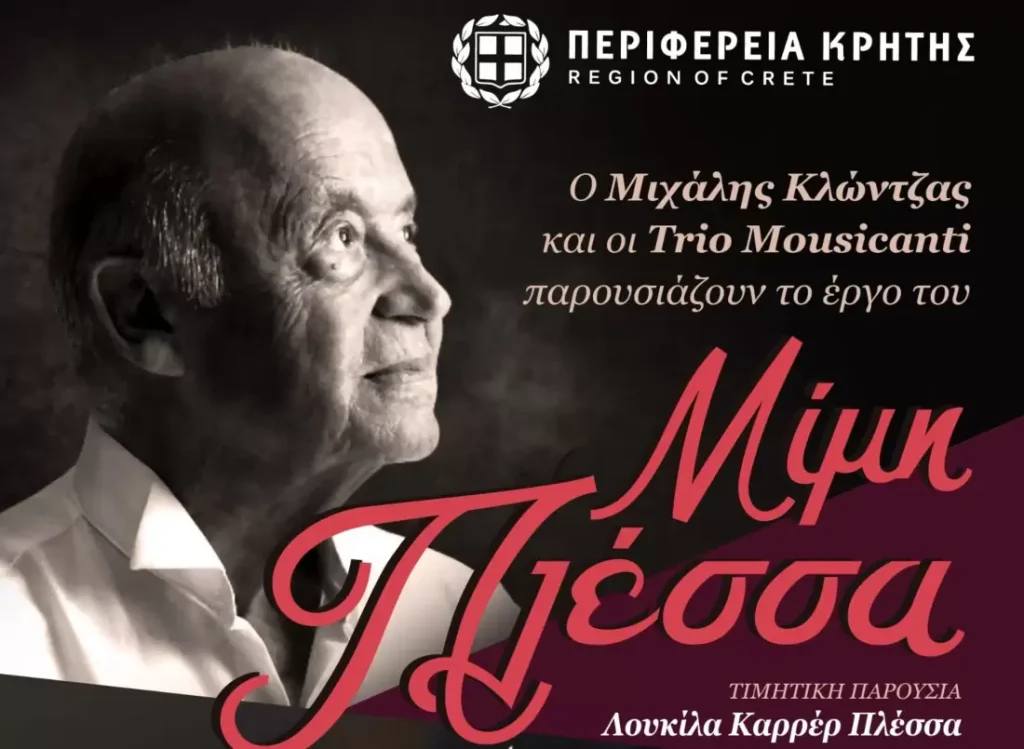 Συναυλία-αφιέρωμα στον αξέχαστο Μίμη Πλέσσα θα πραγματοποιηθεί με την στήριξη της Περιφέρειας Κρήτης οργανωμένη από τον Μιχάλη Κλώντζα και την Λουκίλα Καρρέρ-Πλέσσα, σύζυγο του μουσικοσυνθέτη.