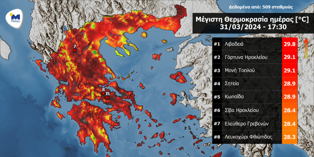 Πολύ υψηλές μέγιστες θερμοκρασίες σημειώθηκαν την Κυριακή 31/03 στο μεγαλύτερο μέρος της χώρας μας σύμφωνα με παρατηρήσεις του δικτύου αυτόματων μετεωρολογικών σταθμών του meteo.gr / Εθνικού Αστεροσκοπείου Αθηνών. Η υψηλότερη θερμοκρασία σημειώθηκε στον μετεωρολογικό σταθμό στη Λιβαδειά και ήταν ίση με 29.8 βαθμούς Κελσίου, σπάζοντας το χθεσινό ρεκόρ για τον μήνα Μάρτιο (από το 2009 που λειτουργεί ο σταθμός). Αξιοσήμειωτο επίσης αποτελεί το γεγονός ότι 143 σταθμοί του δικτύου ξεπέρασαν τους 25 βαθμούς Κελσίου. Ο χάρτης που ακολουθεί παρουσιάζει τις 8 υψηλότερες θερμοκρασίες που καταγράφησαν από το δίκτυο των σταθμών του meteo.gr / Εθνικού Αστεροσκοπείου Αθηνών.