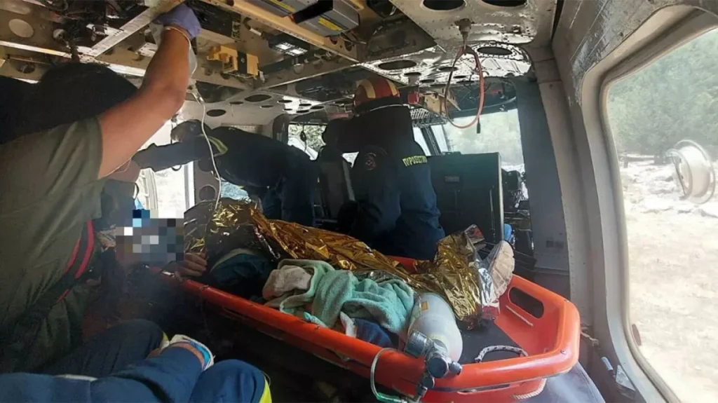 Στο βίντεο φαίνεται πώς οι διασώστες διανύουν τα τελευταία μέτρα, κρατώντας το φορείο με τον τραυματία και το ανεβάζουν στο ελικόπτερο.