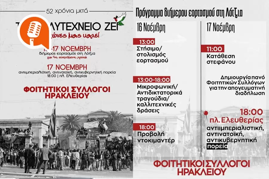 «Το Πολυτεχνείο ζει; 52 χρόνια μετά»: Εκδήλωση τιμής και μνήμης για την επέτειο διοργανώνει Δήμος Ηρακλείου