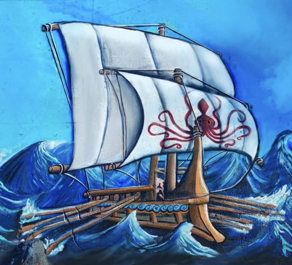 Παρέα στην υπέροχη γοργόνα της παραλιακής λεωφόρου στο Ηράκλειο κάνουν πλέον υπερήφανα μινωικά πλοία, που δίνουν άλλο χρώμα στον «τοίχο με τις ζωγραφιές» της παραλιακής.