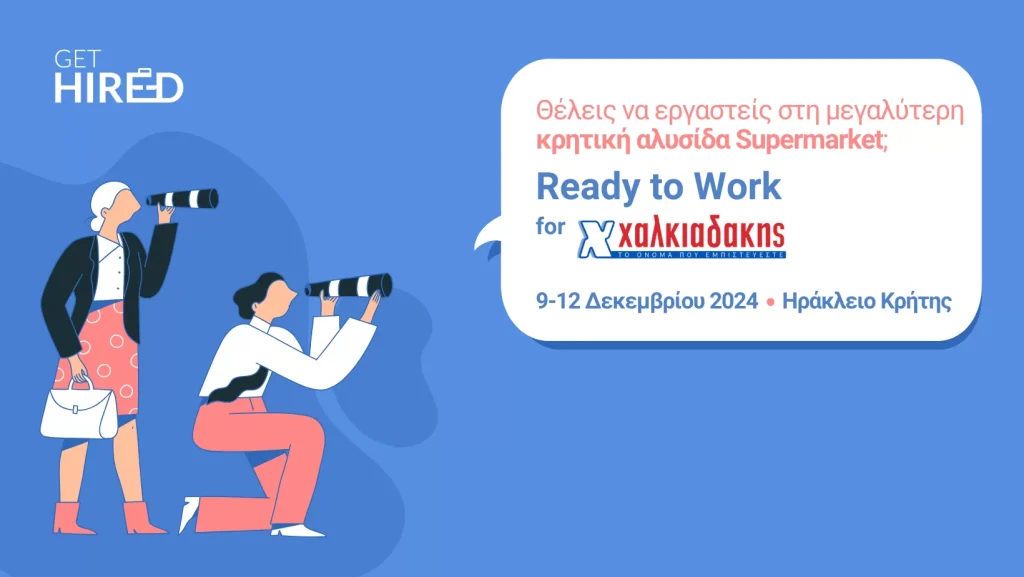 Για όλες τις παραπάνω θέσεις, πραγματοποιείται ένα εξειδικευμένο training από το Get Hired, μέσω του προγράμματος Ready to Work. Τo Ready to Work for Super Market Χαλκιαδάκης είναι ένα δωρεάν εκπαιδευτικό πρόγραμμα, διάρκειας 4 ημερών, με σκοπό τα άτομα που συμμετέχουν να κάνουν upskilling σε δεξιότητες σημαντικές για την αγορά εργασίας και να διεκδικήσουν μία από τις θέσεις εργασίας της εταιρείας. Θα επιλεχθούν για να συμμετέχουν σε αυτό μόνο 15 ενδιαφερόμενοι/ες.