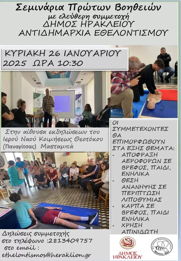 Νέο επιμορφωτικό σεμινάριο Πρώτων Βοηθειών διοργανώνει ο Δήμος Ηρακλείου στο πλαίσιο των δράσεων που έχει εγκαινιάσει η Αντιδημαρχία Εθελοντισμού με τίτλο «Προσφορά στο συνάνθρωπο». Η δράση υλοποιείται σε συνεργασία με την ομάδα εθελοντών «Οι φίλοι Ιατρικών Θεραπευτικών Εγχύσεων Μέλισσες-Bees», της οποίας την εποπτεία έχει ο Φυσίατρος Λάζαρος Βακιρτζιάν. Λόγω του μεγάλου ενδιαφέροντος συμμετοχής, τα σεμινάρια θα πραγματοποιούνται και σε συνοικίες της πόλης καθώς και σε χωριά του Δήμου Ηρακλείου. Έτσι, την ερχόμενη Κυριακή 26 Ιανουαρίου το σεμινάριο Πρώτων Βοηθειών θα πραγματοποιηθεί στην αίθουσα εκδηλώσεων του Ιερού Ναού Κοιμήσεως Θεοτόκου (Παναγίτσας) Μασταμπά στις 10:30 το πρωί. Οι συμμετέχοντες θα επιμορφωθούν σε θέματα σχετικά με: