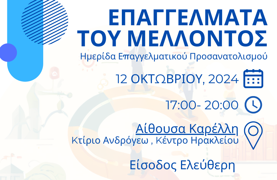 Ο Δήμος Ηράκλειου μέσω των Αντιδημαρχιών Εθελοντισμού και Παιδείας διοργανώνει ημερίδα Επαγγελματικού Προσανατολισμού με θέμα: «Επαγγέλματα του μέλλοντος», σε συνεργασία με το Youth Crete. Η ημερίδα θα πραγματοποιηθεί το Σάββατο 12 Οκτώβριου 2024 στην αίθουσα «Μανόλης Καρέλλης» του Δημοτικού κτιρίου της οδού Ανδρόγεω από τις 17:00 έως 20:00.
