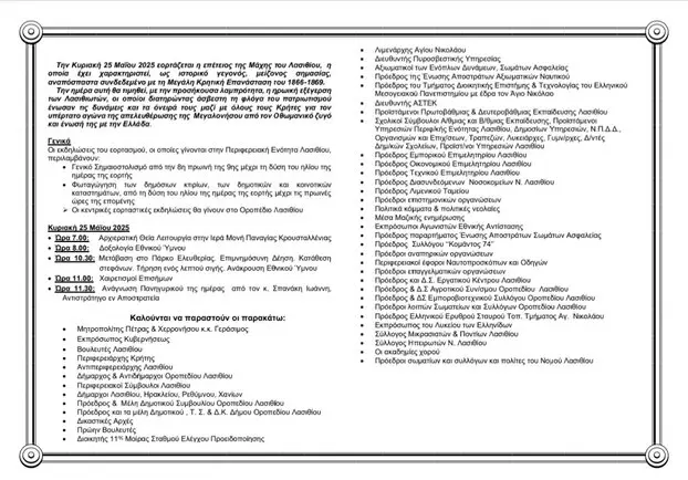 Πότε θα πραγματοποιηθεί.  Στην Ιερά Μονή Παναγίας Κρουσταλλένιας στο Οροπεδίου Λασιθίου θα πραγματοποιηθεί στις 25 Μαΐου ο εορτασμός της 58ης επετείου της Ιστορικής Μάχης του Λασιθίου (20-30 Μαΐου 1867). Η σχετική πρόσκληση αναφέρει: Σας προσκαλούμε να παρευρεθείτε στον εορτασμό της 158ης επετείου της Ιστορικής Μάχης του Λασιθίου (20-30 Μαΐου 1867), που θα πραγματοποιηθεί την Κυριακή 25 Μαΐου 2025 στην Ιερά Μονή Παναγίας Κρουσταλλένιας στο Οροπεδίου Λασιθίου, σύμφωνα με το επισυναπτόμενο πρόγραμμα. Η Παρουσία σας θα μας τιμήσει ιδιαίτερα  Ο Αντιπεριφερειάρχης Ο Δήμαρχος Οροπεδίου Λασιθίου Ιωάννης Ανδρουλάκης