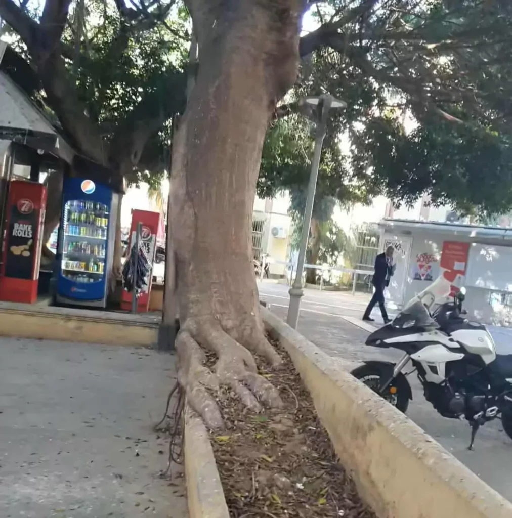 Όπως φαίνεται στις φωτογραφίες που έστειλε ακροατής στο «ΘΕΜΑ Κρήτης», οι ρίζες του δέντρου έχουν «σηκώσει» το χώμα, ενώ ήδη βρίσκονται έξω από τον οριοθετημένο χώρο.
