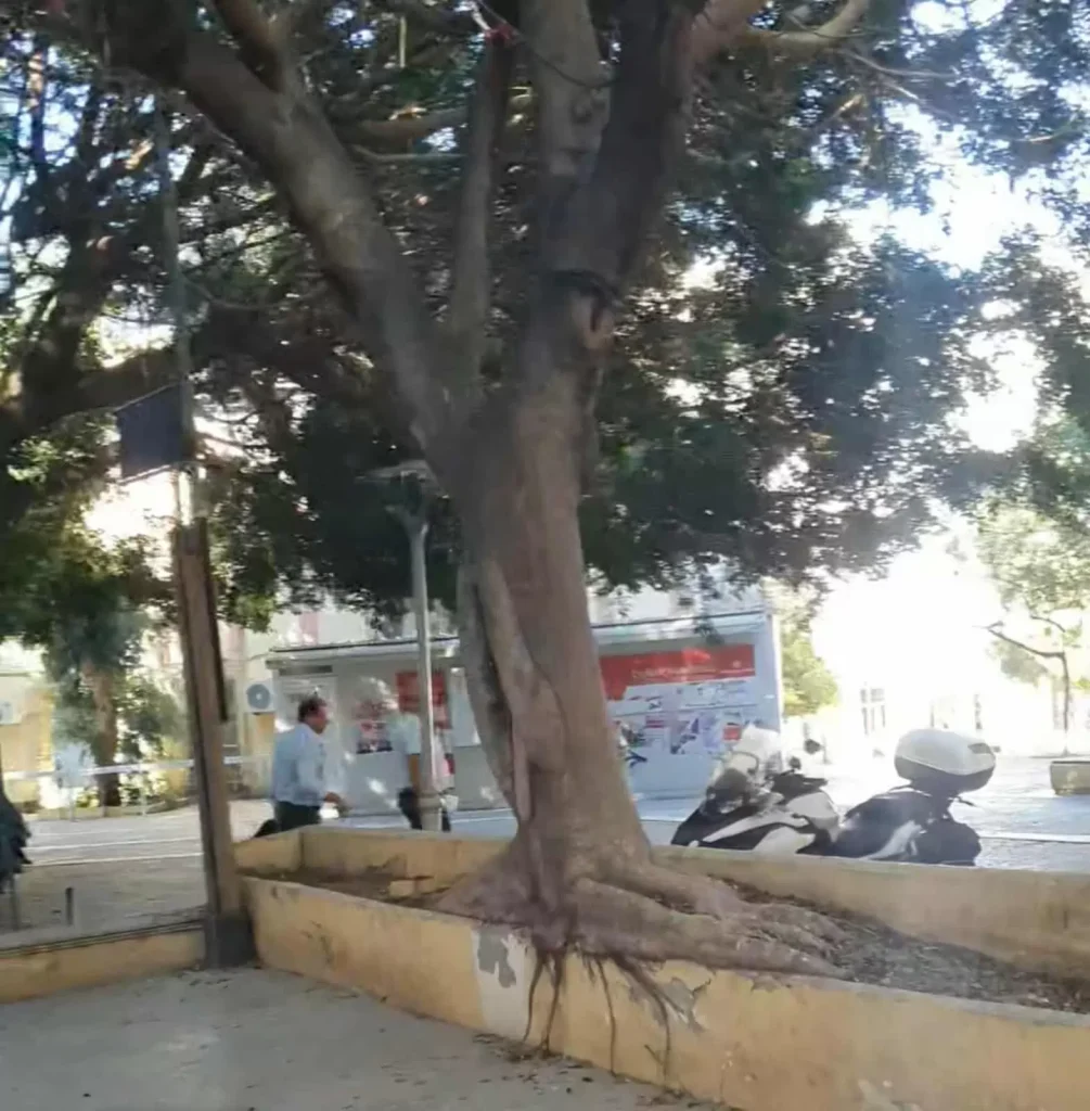 Ένα επικίνδυνο δέντρο «παραμονεύει» στην πλατειά πίσω από το κτίριο της Περιφέρειας Κρήτης.