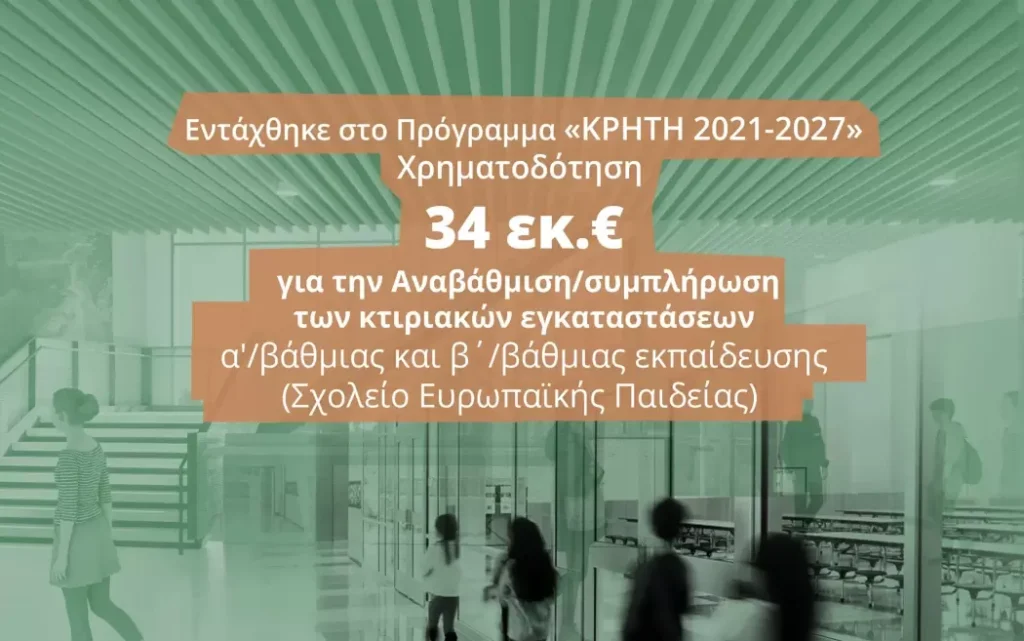 Σε μια σημαντική πρωτοβουλία για την αναβάθμιση των εκπαιδευτικών υποδομών της Κρήτης προχωρά η Περιφέρεια, με την έκδοση πρόσκλησης για την ανέγερση του νέου Σχολείου Ευρωπαϊκής Παιδείας στο Ηράκλειο. Η δημόσια δαπάνη που διατίθεται για το έργο ανέρχεται σε 34.000.000,00€ και καλύπτεται από το Πρόγραμμα «Κρήτη» 2021-2027 με τη συγχρηματοδότηση του Ευρωπαϊκού Ταμείου Περιφερειακής Ανάπτυξης (ΕΤΠΑ).