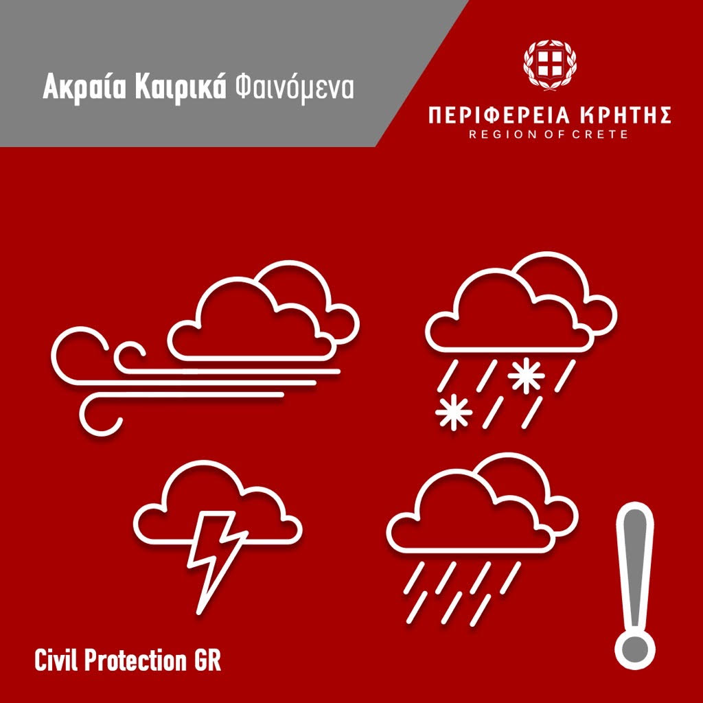 Η Πολιτική Προστασία Περιφέρειας Κρήτης ενημερώνει ότι όλες οι Υπηρεσίες του Μηχανισμού Πολιτικής Προστασίας έχουν τεθεί σε κατάσταση κινητοποίησης Red Code από τις βραδινές ώρες Δευτέρας έως και σήμερα Τρίτη 27.01.2026, καθώς προβλέπεται επιδείνωση του καιρού με κύρια χαρακτηριστικά τις κατά τόπους ισχυρές βροχές και καταιγίδες.