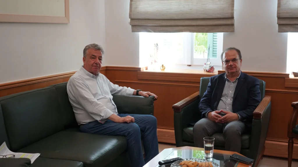 Συνάντηση εργασίας πραγματοποιήθηκε σήμερα στην Περιφέρεια Κρήτης μεταξύ του Περιφερειάρχη Σταύρου Αρναουτάκη και του Προέδρου της Περιφερειακής Ένωσης Δήμων Κρήτης και Δημάρχου Ρεθύμνης, Γιώργου Μαρινάκη.