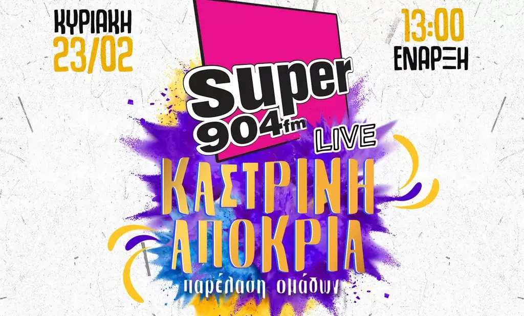 Μια μεγάλη γιορτή από το μεγάλο της Κρήτης!  Το πιο super καρναβάλι του Νησιού έρχεται… Η αντίστροφη μέτρηση για το Kαστρινό Kαρναβάλι 2025 έχει ξεκινήσει και το… ραντεβού έχει δοθεί στη 1 το μεσημέρι. Όλοι θέλουν να συμμετάσχουν στο πιο ξέφρενο καρναβάλι… Με Super 90.4 ζωντανά από το κέντρο του Ηρακλείου. Γιώργος Μαυράκης, Νεκτάριος Βαζακόπουλος, Μπάμπης Μεραμβελιωτάκης, Νίκος Μαλτεζάκης, Ειρήνη Παγωμένου και Αναστασία Τορνεσάκη μεταδίδουν Live τον παλμό του καρναβαλιού σε όλη την Κρήτη μέσα από την συχνότητα του Super 904! Καστρινό καρναβάλι…. στον μεγάλο της Κρήτης! Μεγάλοι Χορηγοί Ανθρακούχο φυσικό μεταλλικό νερό ζάρος με νέα γεύση Γκρέιπφρουτ- Γιούζου Κρουασάν Choco Big Καταστήματα Electro-net Πιτσουλάκης – Ρομπογιαννάκης Ishtar Hamam, Delta Kteo Ηρακλείου και Χανίων