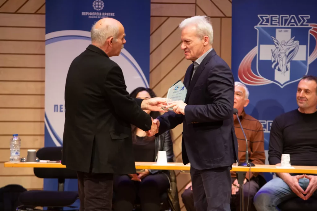 Ο Δήμαρχος Ηρακλείου στο χαιρετισμό του, αφού καλωσόρισε στο Ηράκλειο την Πρόεδρο του ΣΕΓΑΣ «και ίνδαλμα του κλασικού αθλητισμού» όπως χαρακτηριστικά ανέφερε, καθώς και όλους τους αθλητές και εκπροσώπους σωματείων απ’ όλη την Κρήτη, ανέφερε ότι παραλαμβάνει το βραβείο εξ ονόματος όλων όσων υπηρετούν με τον αθλητισμό στο Δήμο Ηρακλείου: «Παραλαμβάνω αυτό το βραβείο εξ ονόματος των ανθρώπων που υπηρετούν τον αθλητισμό στο Δήμο Ηρακλείου και των αθλητών του Ηρακλείου, των αθλουμένων και των φιλάθλων, που είναι πάρα πολλοί. Η αθλητική δραστηριότητα στο Ηράκλειο έχει ένα πάρα πολύ μεγάλο εύρος από τον πρωταθλητισμό, στον μαζικό αθλητισμό και το αντίστροφο και οι υποδομές μας είναι τέτοιες, για τοπικές Εθνικές, Ευρωπαϊκές και διεθνείς διοργανώσεις».