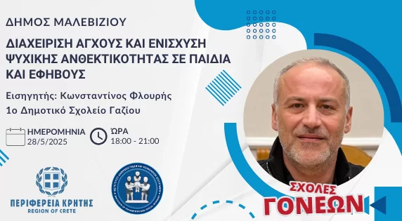 Συνεχίζονται οι Σχολές Γονέων της Περιφέρειας Κρήτης, σε συνεργασία με το Ινστιτούτο Ανθρωπιστικών και Κοινωνικών Επιστημών (ΙΑΚΕ) και την υποστήριξη του Δήμου Μαλεβιζίου. Η προσεχής συνάντηση με θέμα: «Διαχείριση άγχους και ενίσχυση ψυχικής ανθεκτικότητας σε παιδιά και εφήβους» θα πραγματοποιηθεί την Τετάρτη 28 Μαΐου 2025 στο 1ο Δημοτικό Σχολείο Γαζίου και ώρα 18:00-21:00.