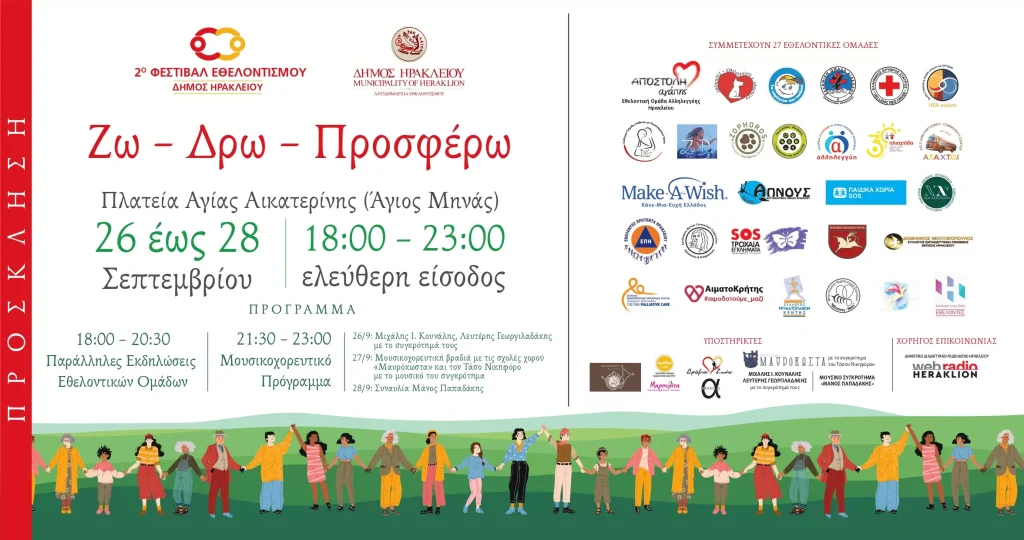 Με τη συμμετοχή 27 εθελοντικών ομάδων και με πλούσιο πρόγραμμα έρχεται το 2ο Φεστιβάλ Εθελοντισμού του Δήμου Ηρακλείου από την Αντιδημαρχία Εθελοντισμού από τις 26 έως τις 28 Σεπτεμβρίου στην Πλατεία Αγίας Αικατερίνης στην καρδιά της πόλης.