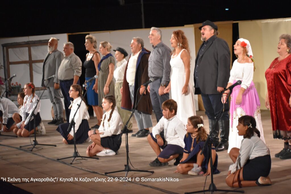 Στο κατάμεστο Κηποθέατρο Ν. Καζαντζάκης παίχτηκε την Κυριακή στις 22 Σεπτεμβρίου η παράσταση του θεατρικού έργου του Μάνου Ταμιωλάκη «Η Σκόνη της Αγκαραθιάς», που σκηνοθέτησε η Ευδοξία Κλεισαρχάκη. Οι 1200 θεατές, που γέμισαν ασφυκτικά το Κηποθέατρο, είχαν την ευκαιρία να παρακολουθήσουν μια κωμωδία με έξυπνους διαλόγους, γεμάτους νοήματα, που καταδεικνύουν παράλληλα τη ζωή στα χωριά της Κρήτης την εποχή του εμφυλίου και της κατοχής. Το κείμενο είναι βασισμένο στην προσωπική μαρτυρία του Μανώλη Στρατάκη του Μαθιού με καταγωγή από τη Γαρίπα, ο οποίος κατέγραψε με λεπτομέρεια τις φάρσες που έκανε στους χωριανούς του. Ωστόσο, μέσα από αυτήν την καταγραφή αναδεικνύονται στοιχεία πολιτισμικά της εποχής, οι δυσκολίες της ζωής, η φτώχεια, η ανέχεια, το κουτσομπολιό, οι λύπες και οι χαρές, η προδοσία αλλά και η συγχώρεση. Οι έξυπνοι διάλογοι Οι ηθοποιοί, παρόλο που είναι ερασιτέχνες, υποδύθηκαν τους χαρακτήρες με αυθεντικότητα, η σκηνοθεσία ήταν ευρηματική, η μουσική συντονιζόταν άψογα με την πλοκή του έργου και τα σκηνικά αντικείμενα –αυθεντικά κι εκείνα- προέρχονται από την εποχή της παραδοσιακής κοινωνίας που έχει παρέλθει πια ανεπιστρεπτί. Το έργο μιλάει στην καρδιά των θεατών, γιατί, όπως φαίνεται, ανακινεί κοινές μνήμες που μας συνδέουν όλους, όπως και πολλά συναισθήματα. Το τέλος του εκπλήσσει τον θεατή, καθώς η πλοκή του μεταστρέφεται σταδιακά από την κωμωδία στο δράμα, με αναφορές στον εμφύλιο πόλεμο, στη βοήθεια στον συγχωριανό, στον συνάνθρωπο. Στο τέλος υπερτερεί η ανθρωπιά. Επόμενος σταθμός θα είναι η Αθήνα, αφού η Θεατρική Ομάδα Γαρίπας έχει ήδη δεχτεί πρόσκληση από την Παγκρήτια Ένωση Αττικής να παρουσιάσει το έργο εκεί. Η παράσταση στο Ηράκλειο πραγματοποιήθηκε με τη συνδιοργάνωση της Περιφέρειας Κρήτης, την υποστήριξη του Δήμου Ηρακλείου καθώς και του Πολιτιστικού Συλλόγου Γαρίπας. Συντελεστές: Κείμενο: Μάνος Ταμιωλάκης Σκηνοθεσία: Ευδοξία Κλεισαρχάκη  Παίζουν (με σειρά εμφάνισης): Μπάμπης Γρινιεζάκης, Ειρήνη Βεργαδή, Χρήστος Βασιλάκης, Μάγδα Χαλαμπαλάκη, Μπάμπης Μαράκης, Θωμάς Κλεισαρχάκης, Μανώλης Καλαφάτης, Χρυσούλα Μαράκη, Χρυσούλα Κλεισαρχάκη, Γιώργος Βασιλάκης, Ελευθερία Μαλάτου, Σοφία Μυλωνάκη. Μουσική Επιμέλεια-Αρμόνιο: Θέμης Κρητικός Ακορντεόν: Ειρήνη Γρατσία Ηχοληψία/Φωτισμός: Δημήτρης Χρονάκης/Αντώνης Αλεξάκης Αφίσες/Πρόγραμμα: Kimon.gr Φωτογραφίες/Βίντεο: Νίκος Σωμαράκης