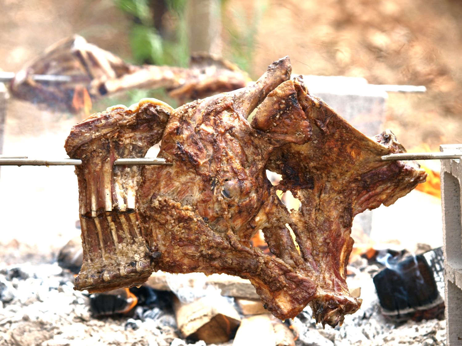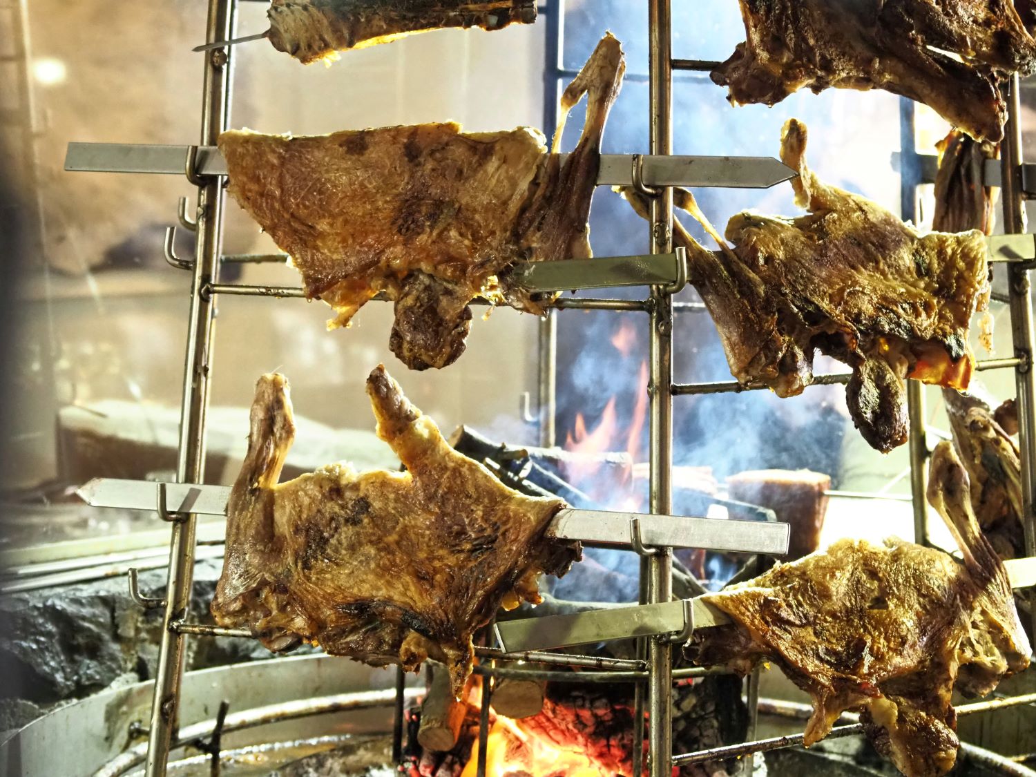 Τα κρέατα δεν προέρχονται από το κυνήγι, αλλά, εδώ και 14.000 χρόνια, μετά την Αγροτική Επανάσταση, είναι εκτροφής. Ευτυχώς, γιατί τα σφάγια που μπαίνουν αντίκρυ στη ζωντανή φωτιά πρέπει να είναι παχιά, και να έχουν λίπος να κάψουν για να μην στεγνώσουν ή καούν τα ίδια. Γι’ αυτό προτιμούν αρνί ή «κωλοπετσωμένο ζυγούρι χρονιάρικο». Όλα αρχίζουν από τον τεμαχισμό του σφαχτού, περίπου στη μέση, αφήνοντας τρία πλευρά προς τη μεριά των νεφρών, όντως προς τα μεριά. Αλλιώς σουβλίζεται το μπροστάρι και αλλιώς το μερί. Για να έχουν ομοιόμορφο πάχος και να ψηθούν σωστά, όλα τα τεταρτημόρια του αρνιού ανοίγονται.