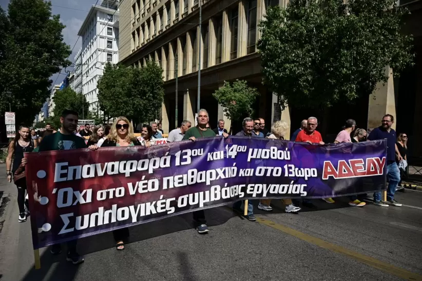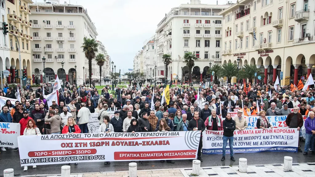 Με συνθήματα όπως «οι εργαζόμενοι δεν είναι μηχανές», συμμετέχοντες και συμμετέχουσες στην απεργία διαδηλώνουν κατά του 13ώρου, λέγοντας ότι απαιτείται πλήρη επαναφορά των ελεύθερων συλλογικών διαπραγματεύσεων, ενώ για το Δημόσιο τόνισαν ότι από τις βασικές διεκδικήσεις αποτελεί η επαναφορά του 13ου και του 14ου μισθού, οι αυξήσεις στις αποδοχές, η κατάργηση του νέου πειθαρχικού δικαίου και κεντρικό αίτημα το πενθήμερο και 35ωρο για το σύνολο των εργαζομένων.