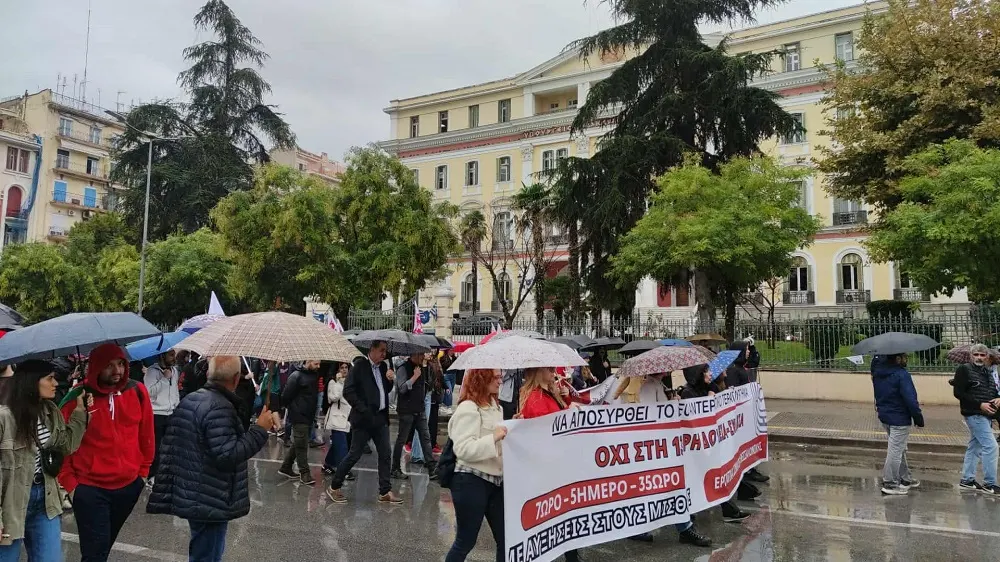 «Όχι στη 13ωρη δουλειά- σκλαβιά», «Μπλόκο στο αντεργατικό τερατούργημα και τις πειθαρχικές διώξεις», «Δεν θα τους αφήσουμε να πάνε τη ζωή μας… τρένο» ήταν μερικά από τα συνθήματα που αναγράφονταν στα πανό που κρατούσαν διαδηλωτές σε τρεις συγκεντρώσεις, οι οποίες έγιναν υπό βροχή, στο κέντρο της πόλης.