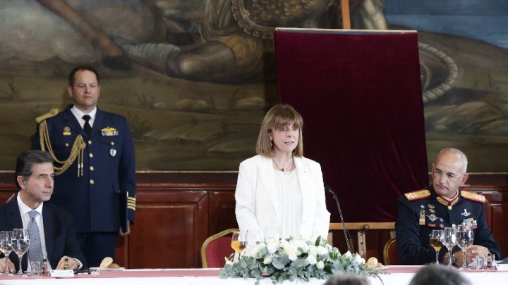 «Ζούμε σε μια εποχή αβεβαιότητας, γεωπολιτικής αναστάτωσης, έντονων διεθνών ανακατατάξεων, αιματηρών συγκρούσεων. Ο συνεχιζόμενος πόλεμος στην Ουκρανία παραμένει ανοιχτή πληγή στην Ευρώπη. Η γειτονιά μας φλέγεται, με απρόβλεπτες επιπτώσεις για το μέλλον ολόκληρης της Ανατολικής Μεσογείου. Η Μέση Ανατολή μοιάζει με πυριτιδαποθήκη, ενώ το ενδεχόμενο μιας γενικευμένης περιφερειακής κρίσης προκαλεί παγκόσμια ανησυχία. Οι προκλήσεις είναι πολλαπλές και υπερβαίνουν τα εθνικά μας σύνορα. Σε αυτό το ασταθές περιβάλλον η Ελλάδα, παράλληλα με την προώθηση των εθνικών της συμφερόντων, παραμένει σταθερά προσηλωμένη στην προώθηση της ειρήνης και του διαλόγου», σημείωσε η κυρία Σακελλαροπούλου.