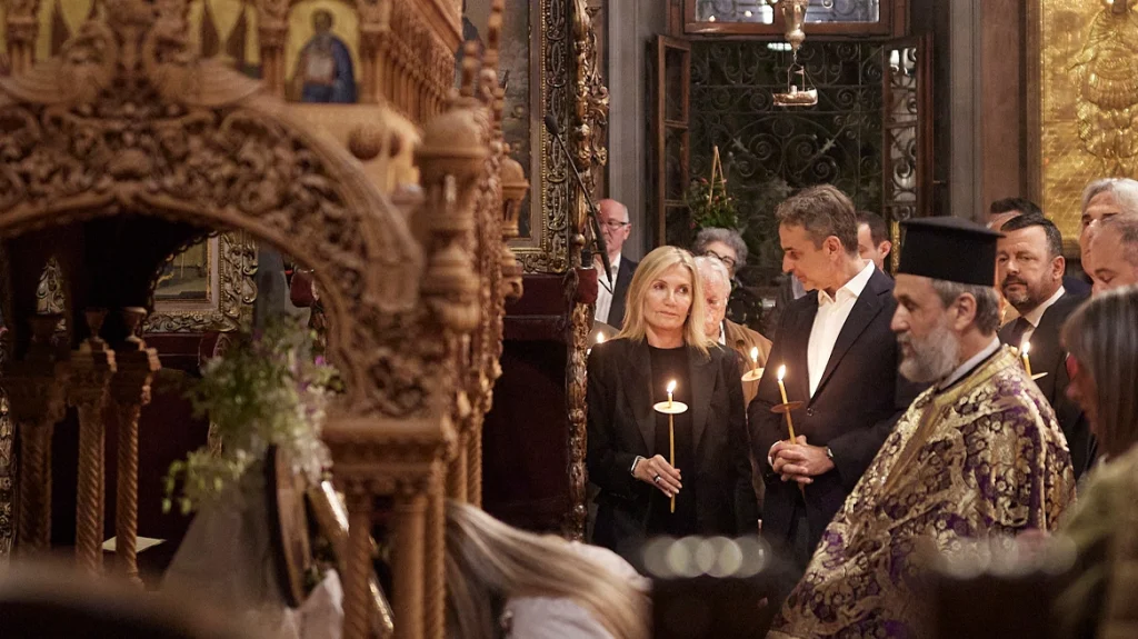 Ο Κυριάκος Μητσοτάκης, συνοδευόμενος από τη σύζυγό του Μαρέβα Γκραμπόφσκι, παρακολούθησε τη Μεγάλη Παρασκευή, την Ακολουθία και την Περιφορά του Επιταφίου στον Ιερό Ναό Ευαγγελιστρίας της Τήνου.