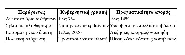 Η κυβέρνηση, δια στόματος του υπουργού Ανάπτυξης κ. Τάκη Θεοδωρικάκου, έχει ζητήσει οι αυξήσεις να μην υπερβαίνουν τις περσινές δηλαδή το το 7%. Ο πήχης για τις νέες αυξήσεις στα ιδιωτικά ασφάλιστρα υγείας μπαίνει εκ νέου από το Υπουργείο Ανάπτυξης, με σαφή πολιτική γραμμή ότι οι αναπροσαρμογές δεν μπορούν να ξεφύγουν από τα όρια του πληθωρισμού και σε καμία περίπτωση δεν θα πρέπει να υπερβούν τα περσινά επίπεδα.