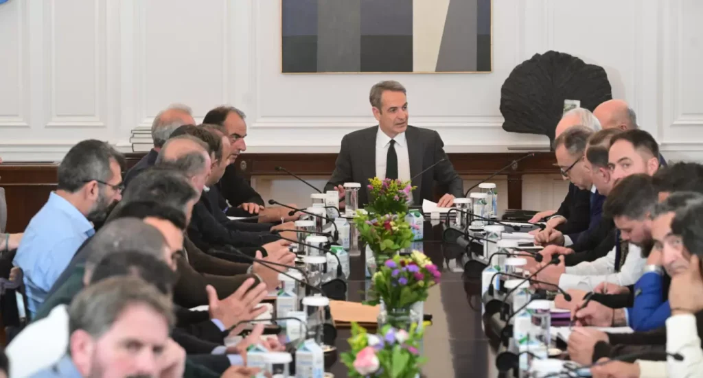 Ολοκληρώθηκε μετά από περίπου 4,5 ώρες η συνάντηση του πρωθυπουργού Κυριάκου Μητσοτάκη με τους εκπροσώπους των αγροτών των μπλόκων, στο Μέγαρο Μαξίμου.