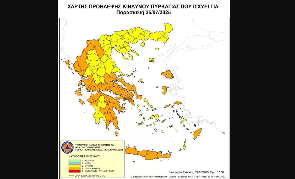 Πολύ υψηλός κίνδυνος πυρκαγιάς (κατηγορία κινδύνου 4) προβλέπεται αύριο σε 11 περιφέρειες της χώρας, σύμφωνα με το Χάρτη Πρόβλεψης Κινδύνου Πυρκαγιάς που εκδίδει η γενική γραμματεία Πολιτικής Προστασίας του υπουργείου Κλιματικής Κρίσης και Πολιτικής Προστασίας (civilprotection.gov.gr).