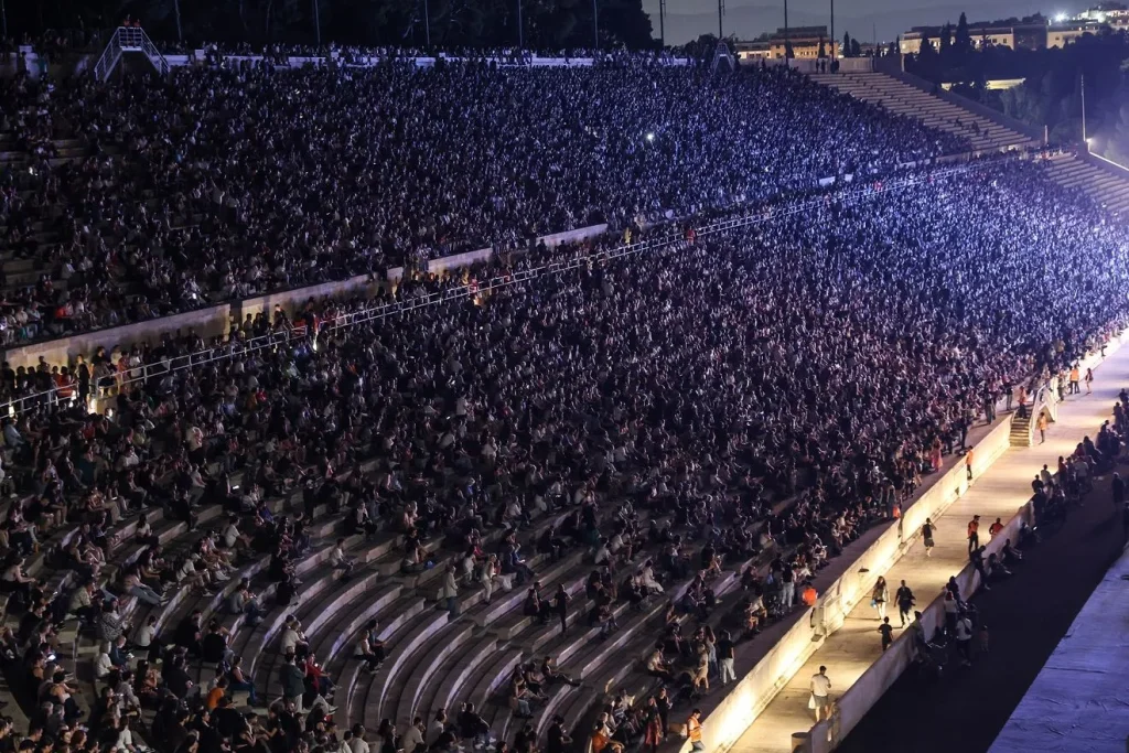 Στην online μετάδοση πλάνα από την Ακρόπολη και το Καλλιμάρμαρο από ψηλά ήταν ένα θέαμα πραγματικά εντυπωσιακό. Οι κερκίδες γεμάτες και μπροστά στη σκηνή νεαρά παιδιά περιμένουν με σεβασμό τους καλλιτέχνες που βγαίνουν διαδοχικά ο ένας μετά τον άλλον.