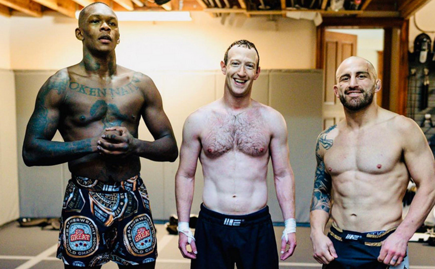 Μια φωτογραφία που ανέβασε στο Instagram χθες, Τρίτη, ο δύο φορές πρωταθλητής μεσαίων βαρών του UFC Ίσραελ Αντεσάνια δείχνει τον Ζούκερμπεργκ, μαζί με τον Αντεσάνια και τον επίσης πρωταθλητή του UFC Άλεξ Βολκανόβσκι, να προπονούνται σε ένα γυμναστήριο στη λίμνη Τάχο της Νεβάδα.