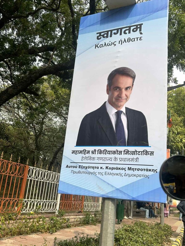 Η αφίσα που κυκλοφόρησε πρόσφατα στην Ινδία, καλωσορίζοντας τον Έλληνα πρωθυπουργό Κυριάκο Μητσοτάκη, έχει πυροδοτήσει σειρά ερμηνειών και ερωτημάτων.