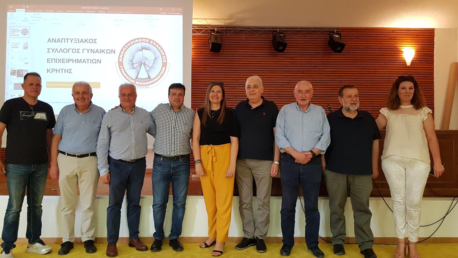 Ευαγγελία Αγγελάκη, Εντεταλμένη Δημοτική Σύμβουλος Τοπικής Επιχειρηματικότητας & Ανάπτυξης Δήμου Μινώα Πεδιάδας, την Εβελίνα Μπάκιντα, Πρόεδρο Αναπτυξιακού Συλλόγου Γυναικών Επιχειρηματιών Κρήτης, Marketing Msc, Ευρωπαϊκές Σπουδές και τους κυρίους: