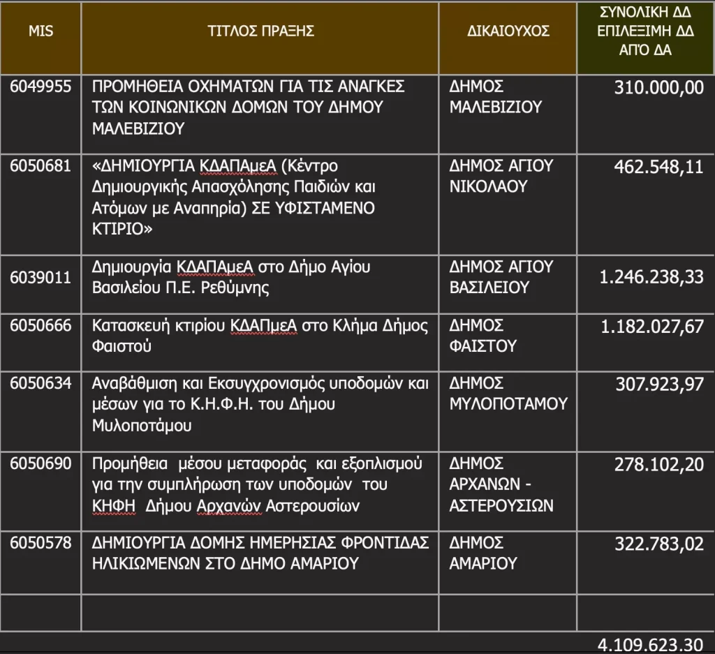 4. Κατασκευή κτιρίου ΚΔΑΠμεΑ στο Κλήμα Δήμος Φαιστού – Δικαιούχος: Δήμος Φαιστού, Επιλέξιμη Δημόσια Δαπάνη: 1.182.027,67 ευρώ.