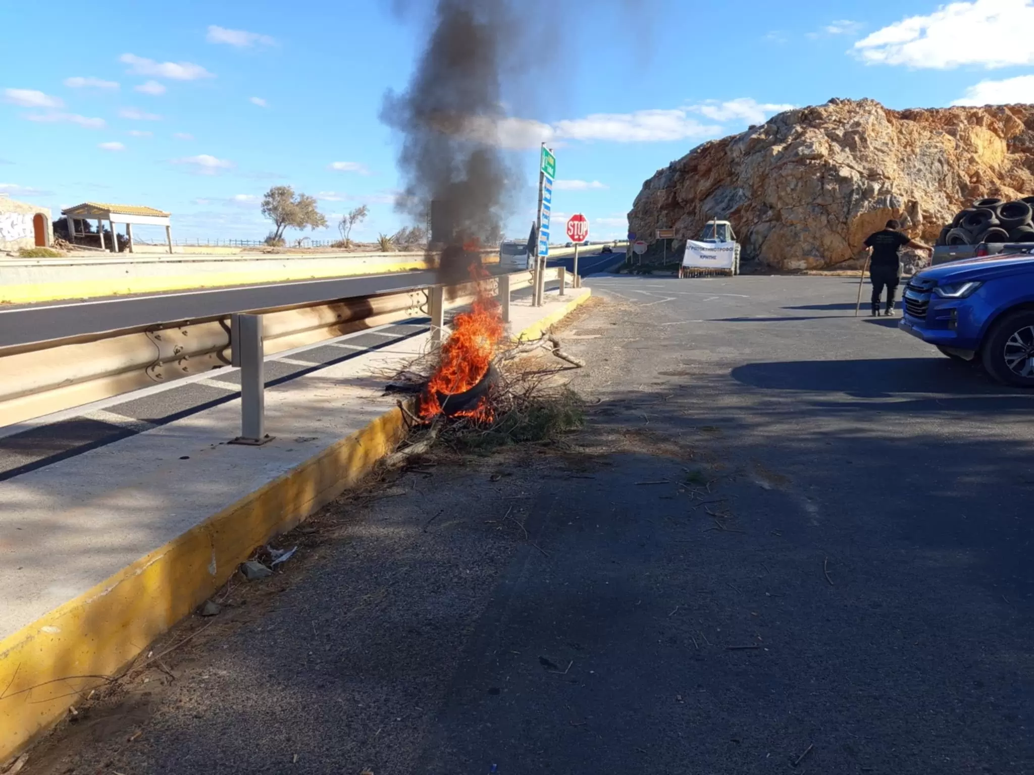 Μετά την ολονύχτια παραμονή τους στο μπλόκο του ΚΤΕΟ, οι κτηνοτρόφοι του νομού Ηρακλείου σήμερα το πρωί άναψαν φωτιές και έκαψαν λάστιχα. Σήμερα στις 12 το μεσημέρι θα συνεδριάσουν και εξετάζουν κλιμάκωση των κινητοποιήσεων τους.