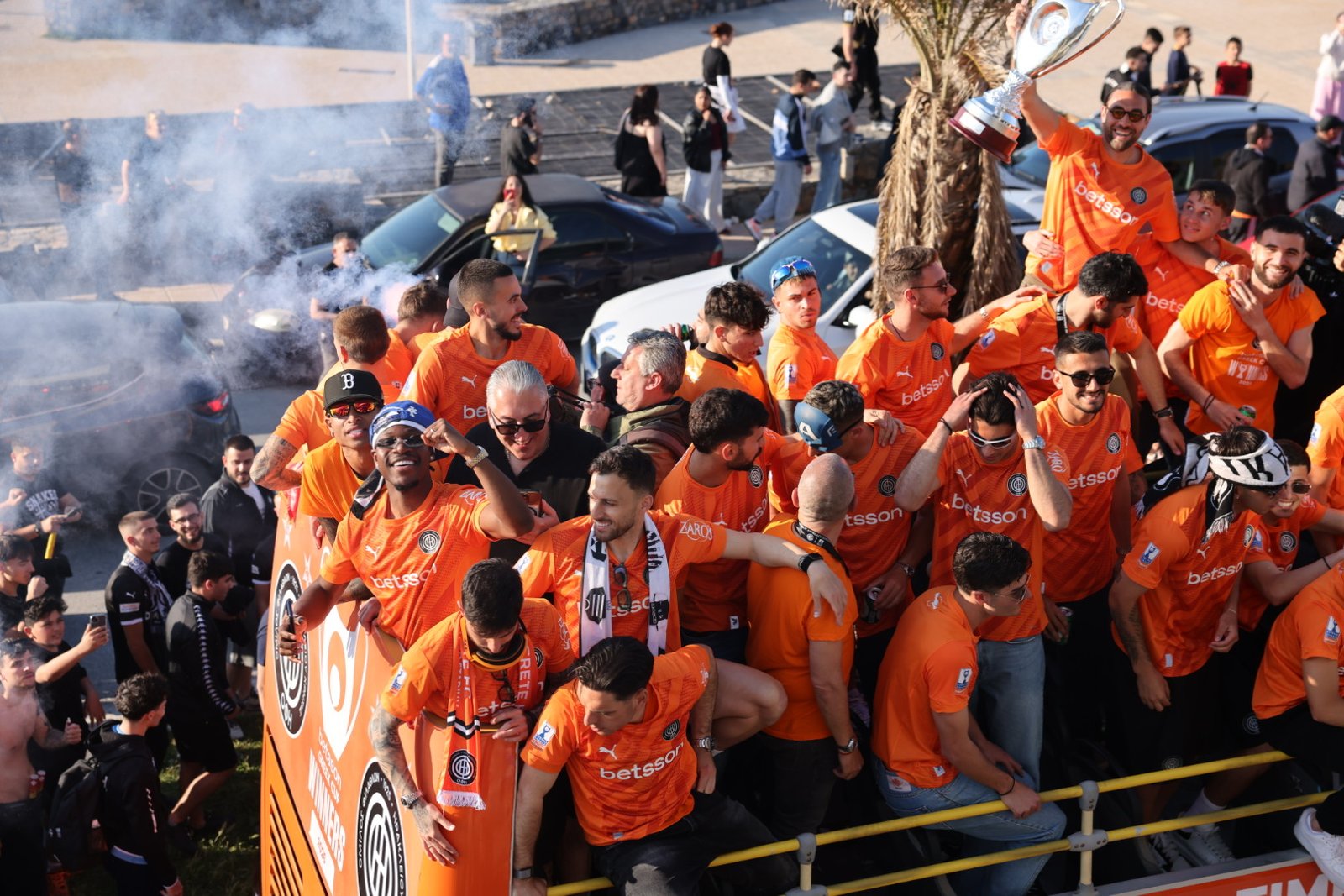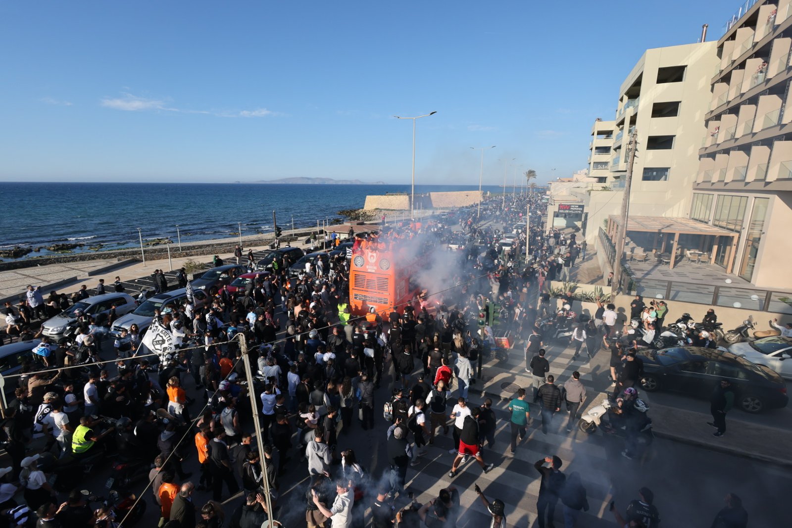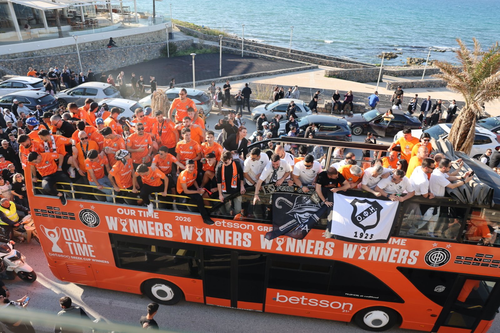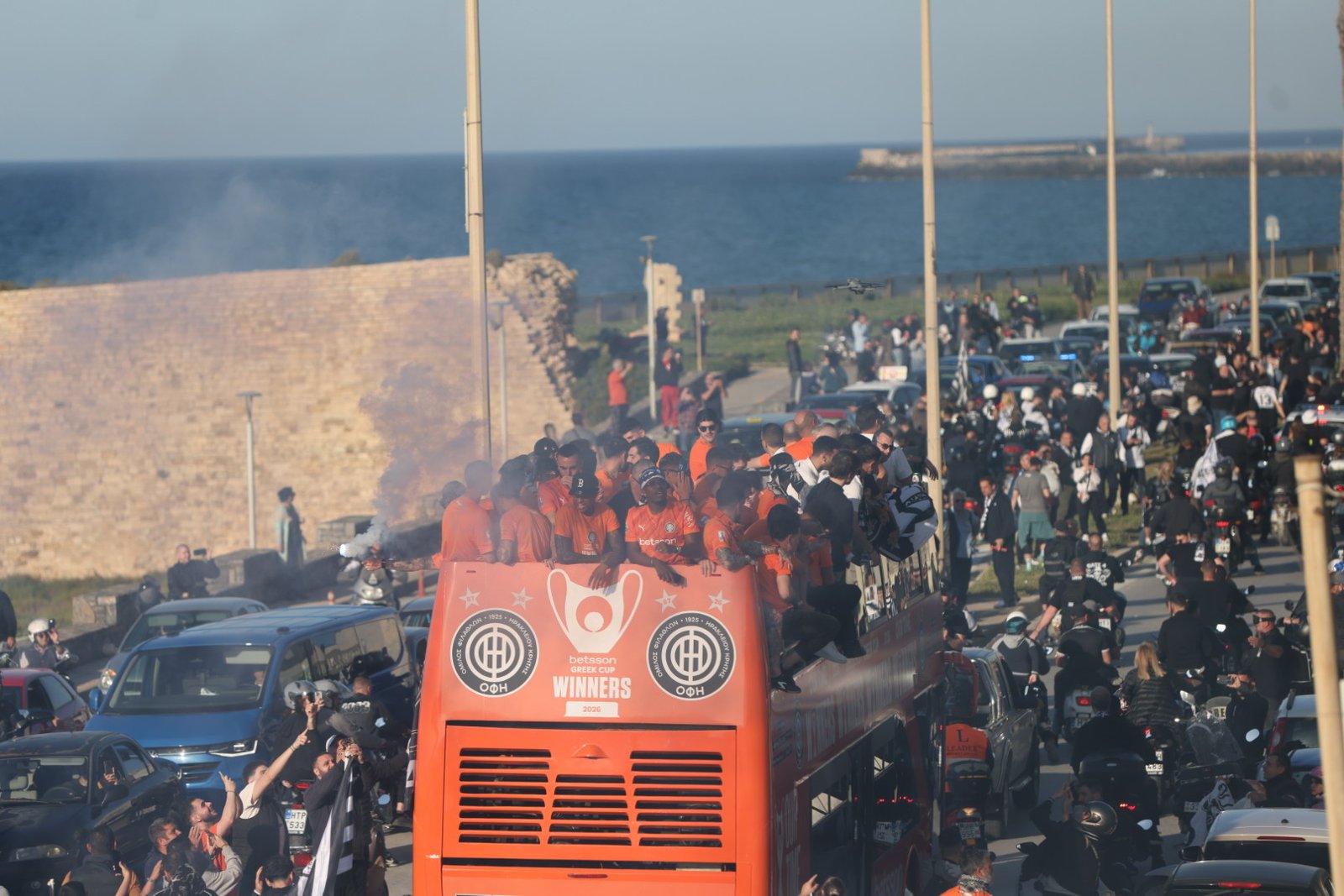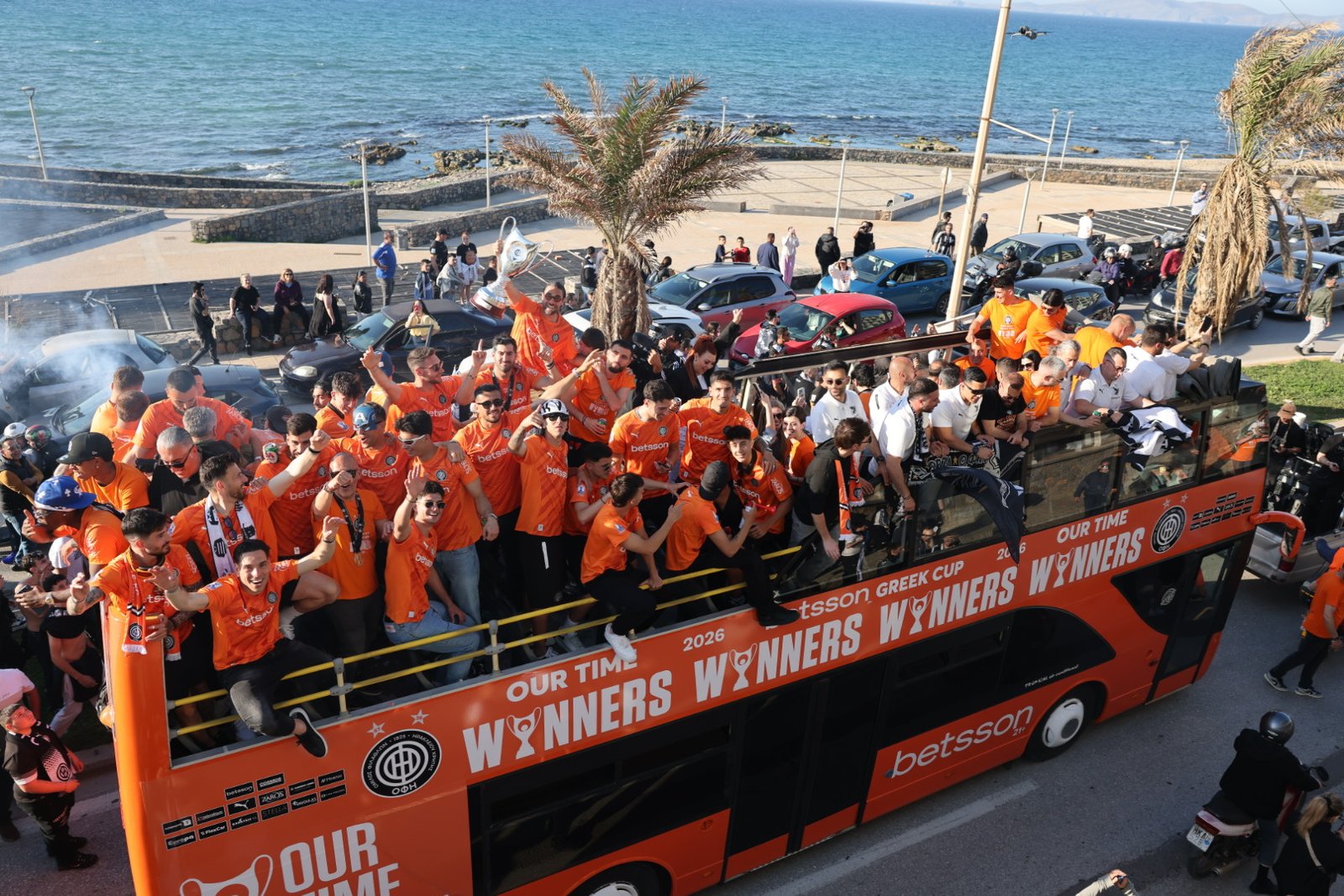 Αυτή την ώρα χιλιάδες είναι οι Ηρακλειώτες που αποθεώνουν τον ΟΦΗ. Το ανοιχτό πούλμαν  κάνει παρέλαση από το «Γεντί Κουλέ» περιφέρεται στους κεντρικούς δρόμους της πόλης. Ξεκίνησε από το γήπεδο ομάδας, πέρασε προς τη Σοφ. Βενιζέλου (παραλιακή), πέρασε από τις οδούς Γιαμαλάκη-Αγίου Μηνά-Αβέρωφ, με στάση στην Πλατεία Ελευθερίας.