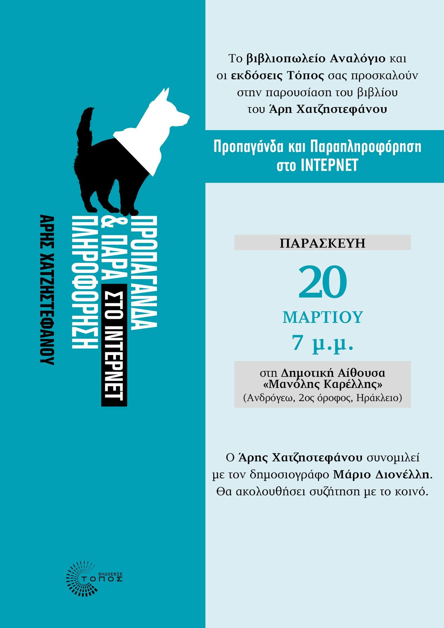 Την Παρασκευή 20 Μαρτίου, στις 7 το απόγευμα στην αίθουσα Μανόλης Καρέλλης στην Ανδρόγεω ο Άρης Χατζηστεφάνου θα συζητήσει για όλα αυτά τα θέματα με τον δημοσιογράφο Μάριο Διονέλλη αλλά και με το κοινό του Ηρακλείου.