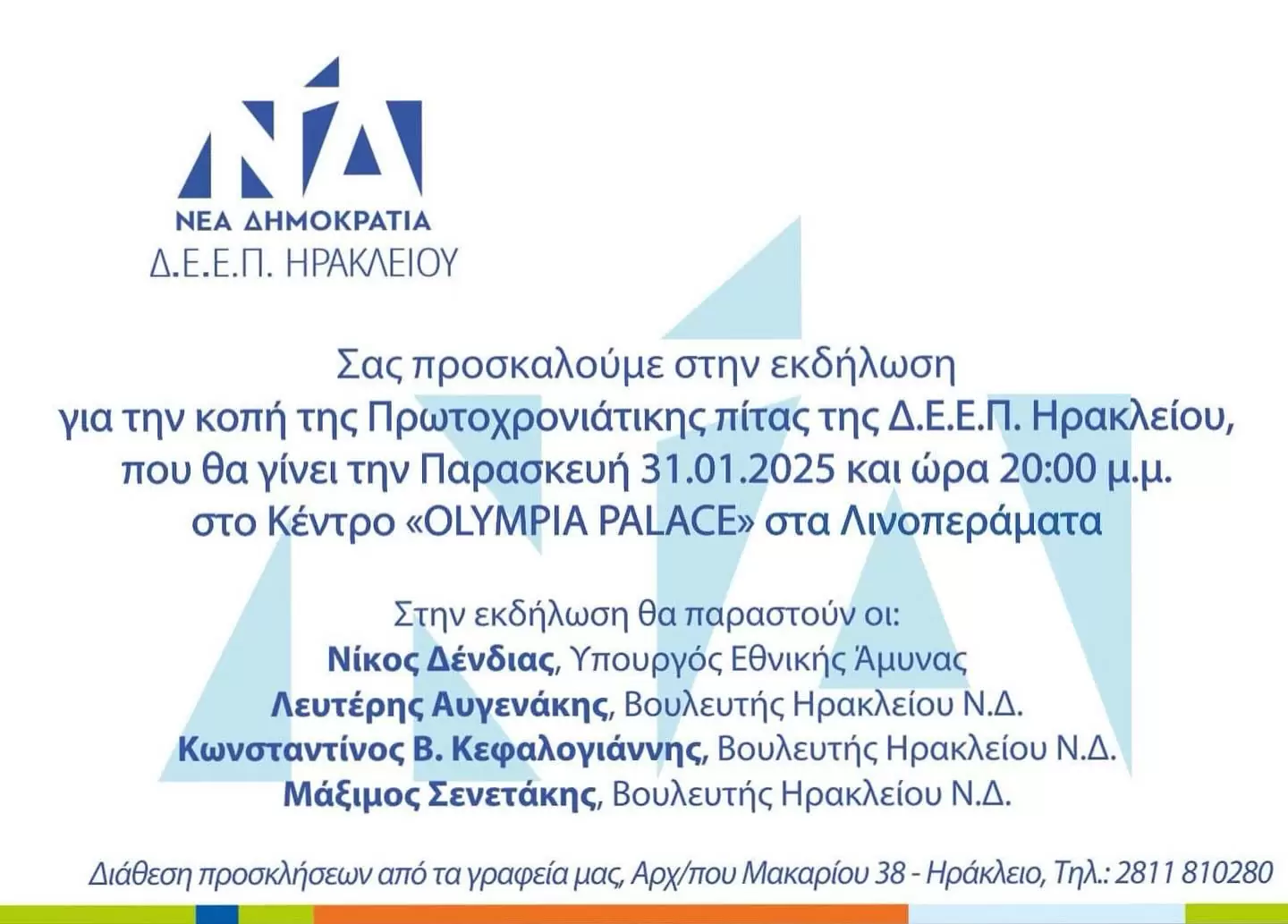 Η Δ,.Ε.Ε.Π. Ηρακλείου της Ν.Δ. κόβει την ερχόμενη Παρασκευή στις 20.00 την πρωτοχρονιάτικη πίτα της στο κέντρο “Olympia Palace” στα Λινοπεράματα.
